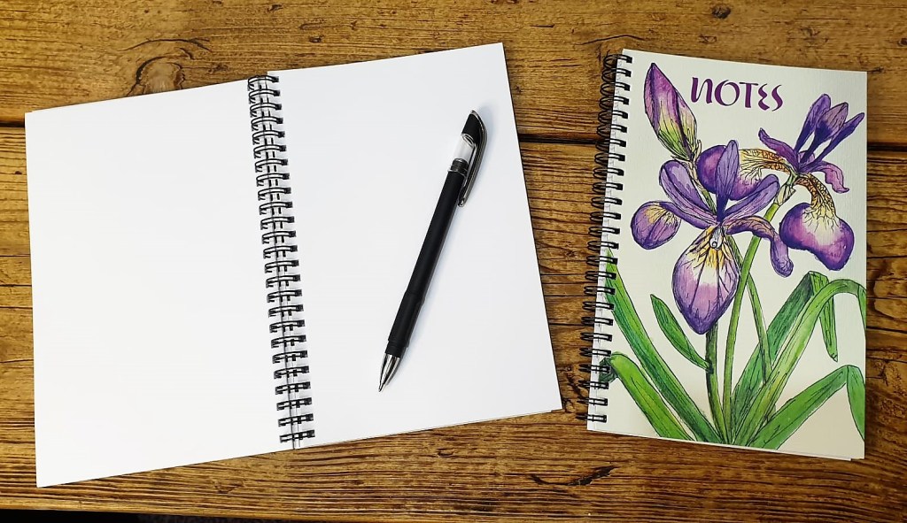 Buy 2 notepads & save £1! 80 Blank pages, Spiral Bound, Original Claire Gullan Artwork PURPLE IRIS Price includes 1st Class Royal Mail Postage UK only £14 PLUS POSTAGE